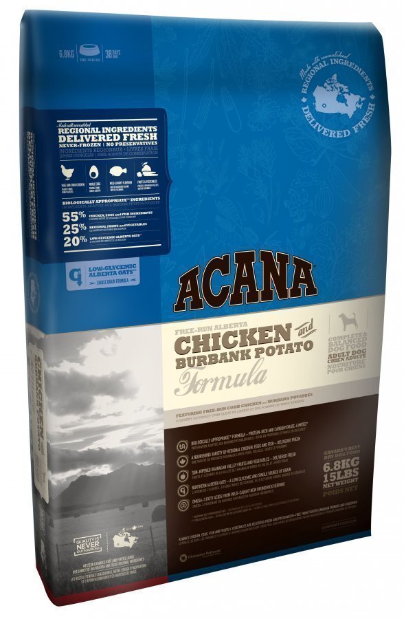 Acana Chicken & Burbank Potato koiranruoka sisältää vapaata kanaa, kokonaisia kananmunia, burbank perunaa, villikalaa sekä hedelmiä ja vihanneksia.