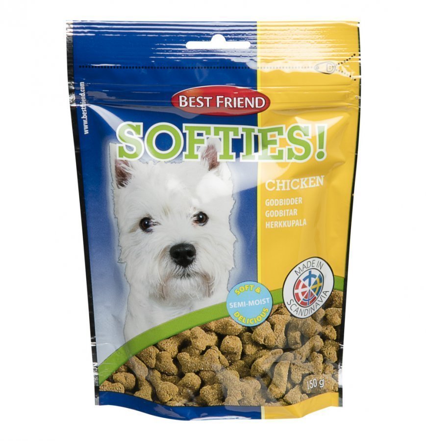 Best Friend Softies lihaisat herkkupalat ovat pehmeitä ja vastustamattoman herkullisia makupaloja kaikille koirille. Pakkauskoko 150 grammaa. Kaikille koirille sopivia pehmeitä makupaloja. Runsaasti proteiinia. Sisältää terveellistä kanaa ja siipikarjaa. Vitaminoitu. Makuna kana. Valmistettu Tanskassa. Pakkauskoko 150 grammaa. Koostumus: vilja, liha- ja eläinperäiset tuotteet (4 % kanaa), sokerit, kasvisperäiset tuotteet, rasvat ja öljyt, kasvikset, kivennäiset. Ravintoainesisältö: valkuainen 20,0 %, . . .