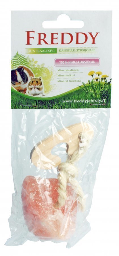 Aidosta, 100 % himalajansuolasta lohkaistu mineraalikivi sopii kaneille ja jyrsijöille ravintolisäksi. Himalajansuolakivi sisältää suolan lisäksi tärkeitä mineraaleja. Puinen koukku ja niininarua, kivien määrä narussa vaihtelee; pakkauskoko 60 g. Valmistusaineet: 100 % Himalajan suola, luonnollinen muoto, keskeiset suolat ja mineraalit