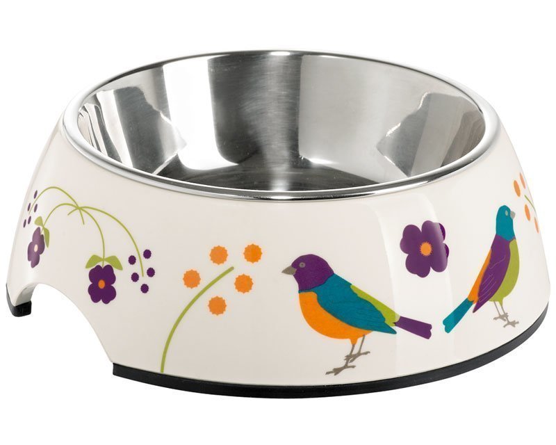 Helppohoitoinen ruokakuppi melamiinia, jossa kaunis lintukuvio.